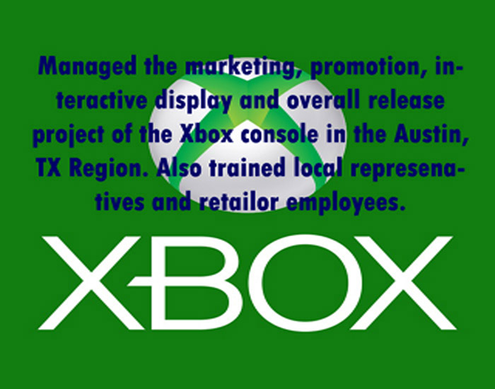 Managed the Xbox release for the Austin district, which included marketing, sales, support, training, positive image, and overall customer awareness. Ensured the project stayed on schedule and was completed on time. Created milestones and goal sets to make sure everyone was doing their job function properly. Oversaw the project to make sure the result was achieved, the resources used efficient, and all of the stakeholders and different interested were involved and satisfied.